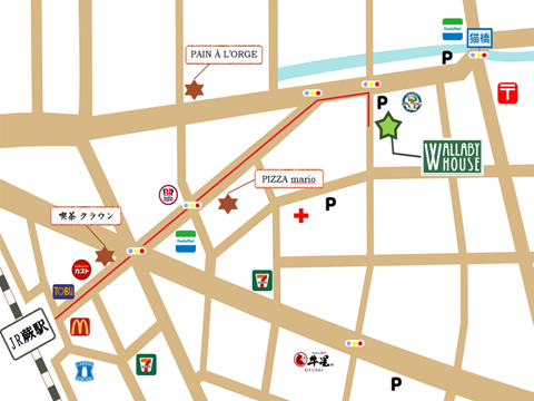 その信号を右折すると20mほど先の左側に「WALLABY HOUSE」がございます(徒歩約8分)。